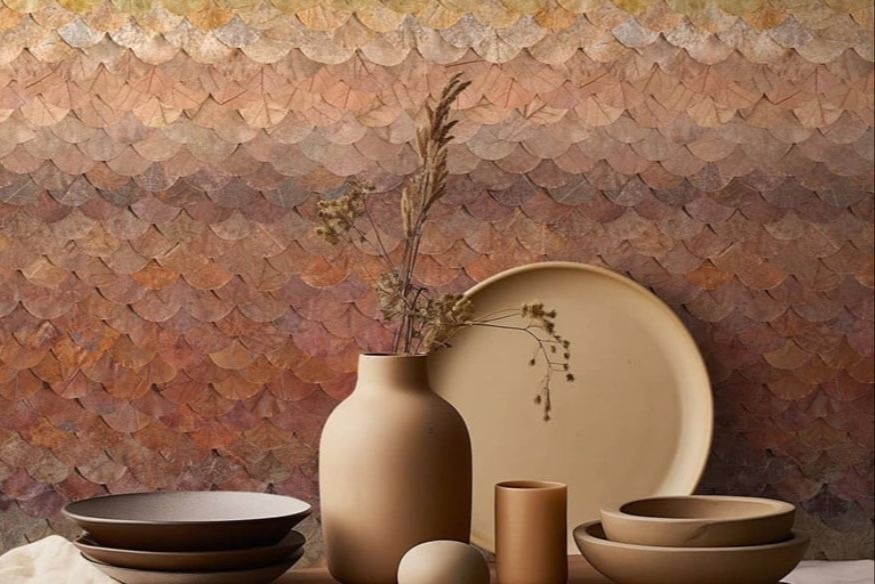 Une fois ses sacs remplis, elle revient à son atelier et elle les plonge pendant des semaines dans un liquide dont elle garde précieusement la recette, pour les transformer en cuir végétal. Une matière souple et pérenne qui garde toutes les caractéristiques esthétiques des feuilles. Puis elle en fait des œuvres d'art, du papier peint, des objets (comme des lampes, des tableaux, des miroirs ou des cadres décoratifs), ce qui lui vaut le titre de "designeuse végétale".