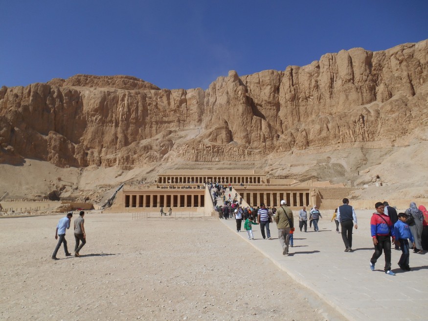 Deir El Bahari, édifié au pied du cirque montagneux dénommé « Montagne de l’Occident » ou «Montagne de Thèbes ouest » ou encore « Demeure d’éternité », présente trois temples, dont le plus grand à droite, le Temple de la Reine Hatshepsout, épouse de Tout Ankhamon (XVIIIème dynastie). Le dieu suprême Amon, père légendaire d’Hatshepsout, porte les deux plumes, symbole de la haute hiérarchie. La naissance divine se trouve dans le premier portique, tandis que le second présente «Pount ». La chapelle de droite est consacrée à Anubis –dieu embaumeur à tête de chacal, fils de Seth et neveu d’Isis et Osiris, et celle de gauche est dédiée à la déesse Hathor, à tête de vache.