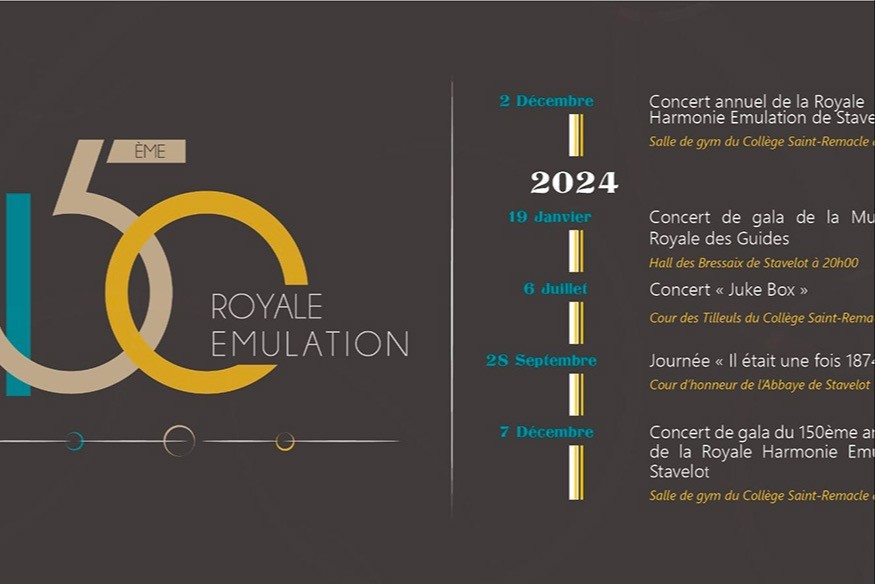 La Royale Emulation de Stavelot, orchestre d’harmonie d’une septantaine de musiciens, fête en 2024 son 150ème anniversaire ! À cette occasion, la société organise tout au long de l’année une série d’événe- ments qui permettront de marquer le coup et de rassembler musiciennes, musiciens, sympathisants et amoureux de la musique et du folklore.